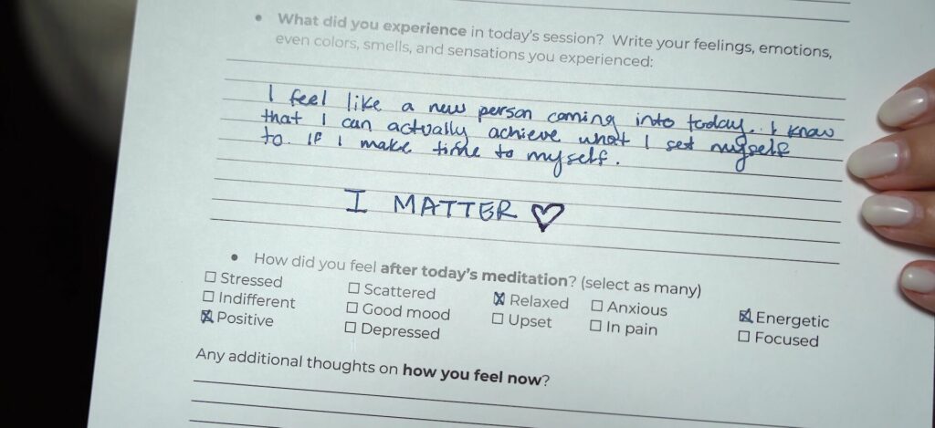Clients choose between a guided or unguided immersive soundtrack. Following the session, clients are prompted to complete a brief journal entry indicating their feelings before and after each session.